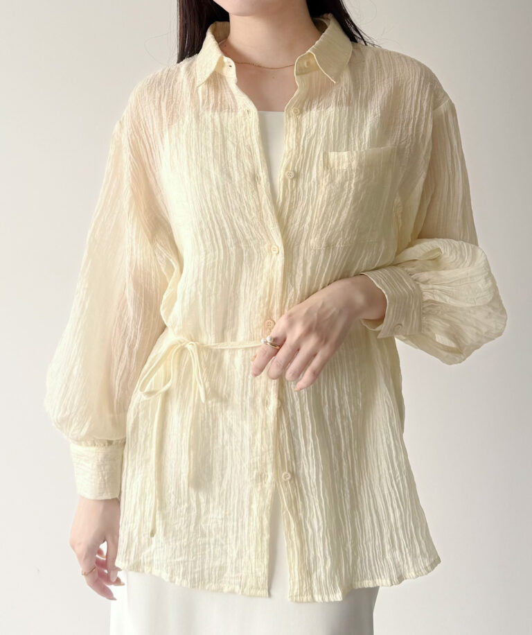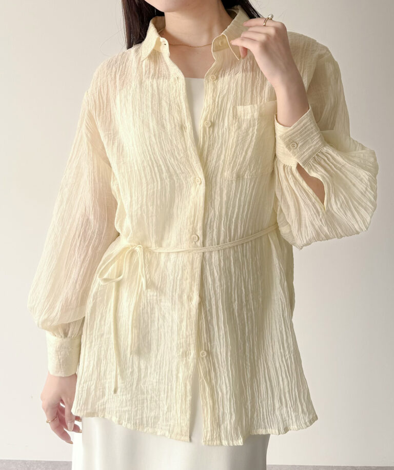 ゆるっと感がかわいいボリュームスリーブシアーシャツ。